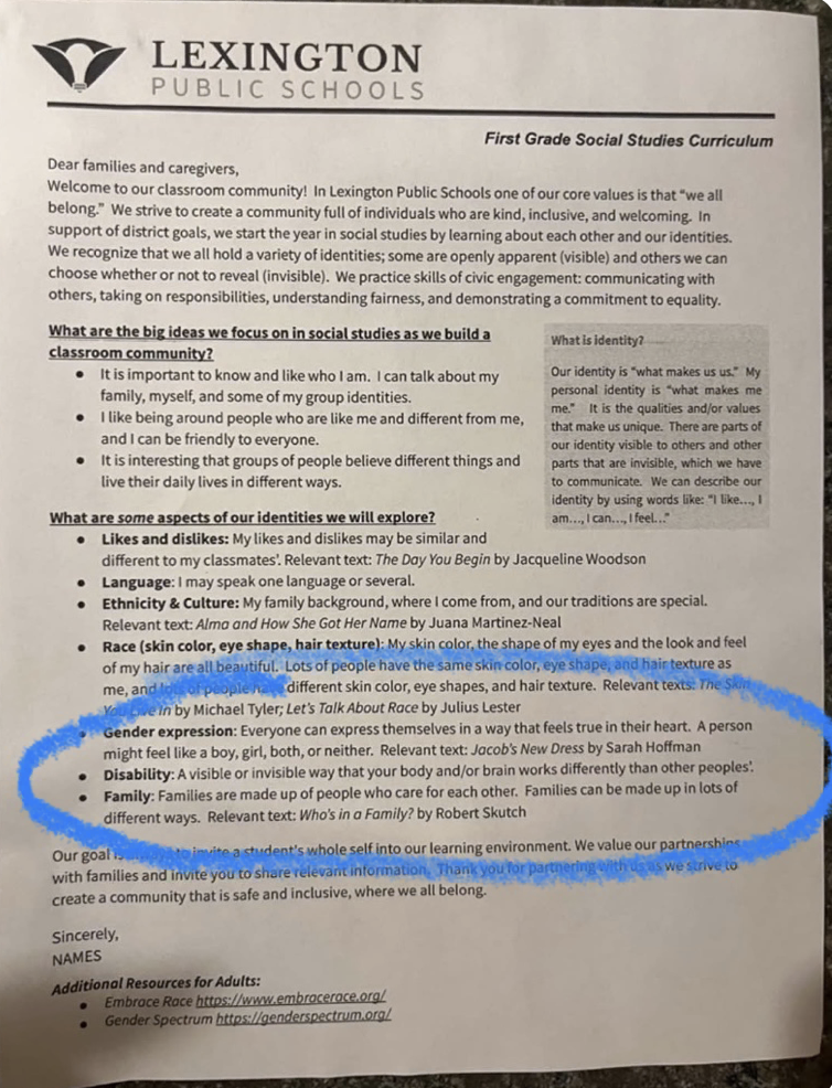 Lexington Public Schools sent a letter home to families and caregivers about their first grade social studies curriculum. They explain that they “start the year in social studies by learning about each other and our identities.” One of the identities they include in this curriculum for six and seven year olds and describe in the letter is “gender expression.” The district subscribes to the ideology that children get to choose if they identify as “a boy or girl or both or neither” and the accompanying text is Jacob’s New Dress.