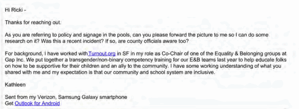 Clark responded, asking Richard if he was referring to policy and signage in the pools and to please forward her a picture for further research. She also touted her work for the queer and trans advocacy organization Turnout as Co-Chair of one of the Equality & Belonging groups at Gap Inc.