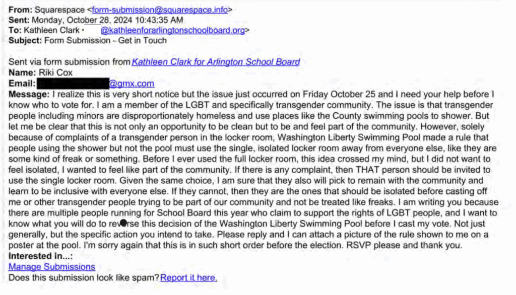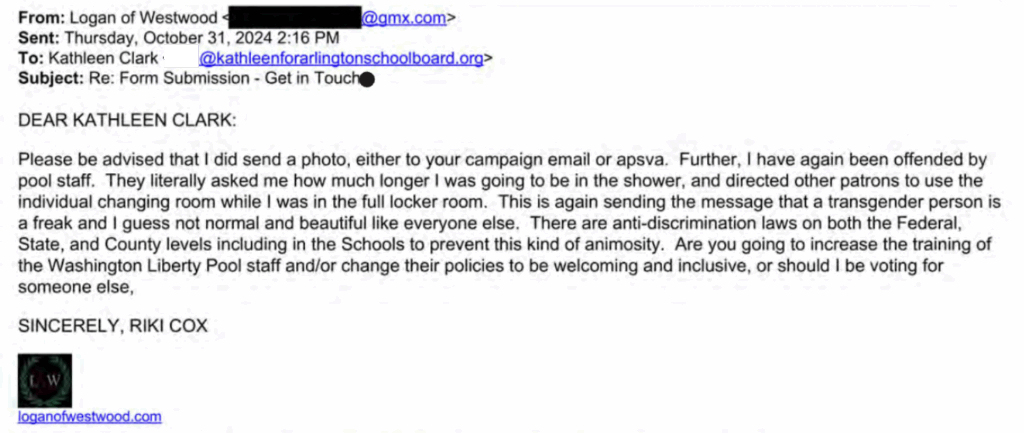 “They literally asked me how much longer I was going to be in the shower, and directed other patrons to use the individual changing room while I was in the full locker room,” he wrote. “This is again sending the message that a transgender person is a freak and I guess not normal and beautiful like everyone else. There are anti-discrimination laws on both the Federal, State, and County levels including in the Schools to prevent this kind of animosity. Are you going to increase the training of the Washington Liberty Pool staff and/or change their policies to be welcoming or inclusive, or should I be voting for someone else.”