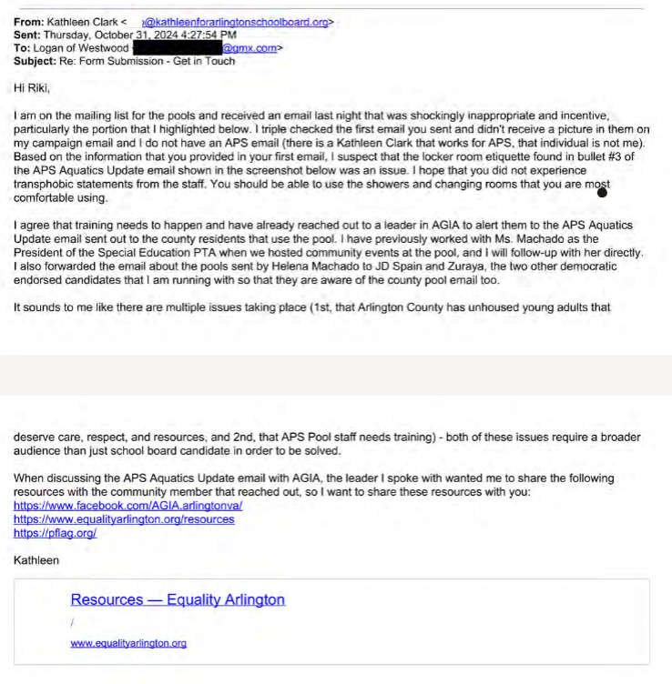 “I agree that training needs to happen and have already reached out to a leader in AGIA [Arlington Gender Identity Alliance] to alert them to the APS Aquatics Update email sent out to the county residents that use the pool,” she continued. “I have previously worked with Ms. Machado as the President of the Special Education PTA when we hosted community events at the pool, and I will follow-up with her directly. I also forwarded the email about the pools sent by Helena Machado to JD Spain and Zuraya, the two other democratic endorsed candidates that I am running with so that they are aware of the county pool email too.”