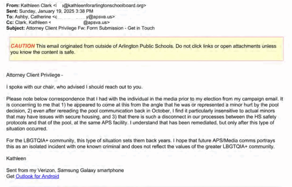 “It sounds to be like there are multiple issues taking place (1st, that Arlington County has unhoused young adults that deserve care, respect, and resources, and 2nd, that APS Pool staff needs training) – both of these issues require a broader audience than just school board candidate in order to be solved,” Clark concluded.