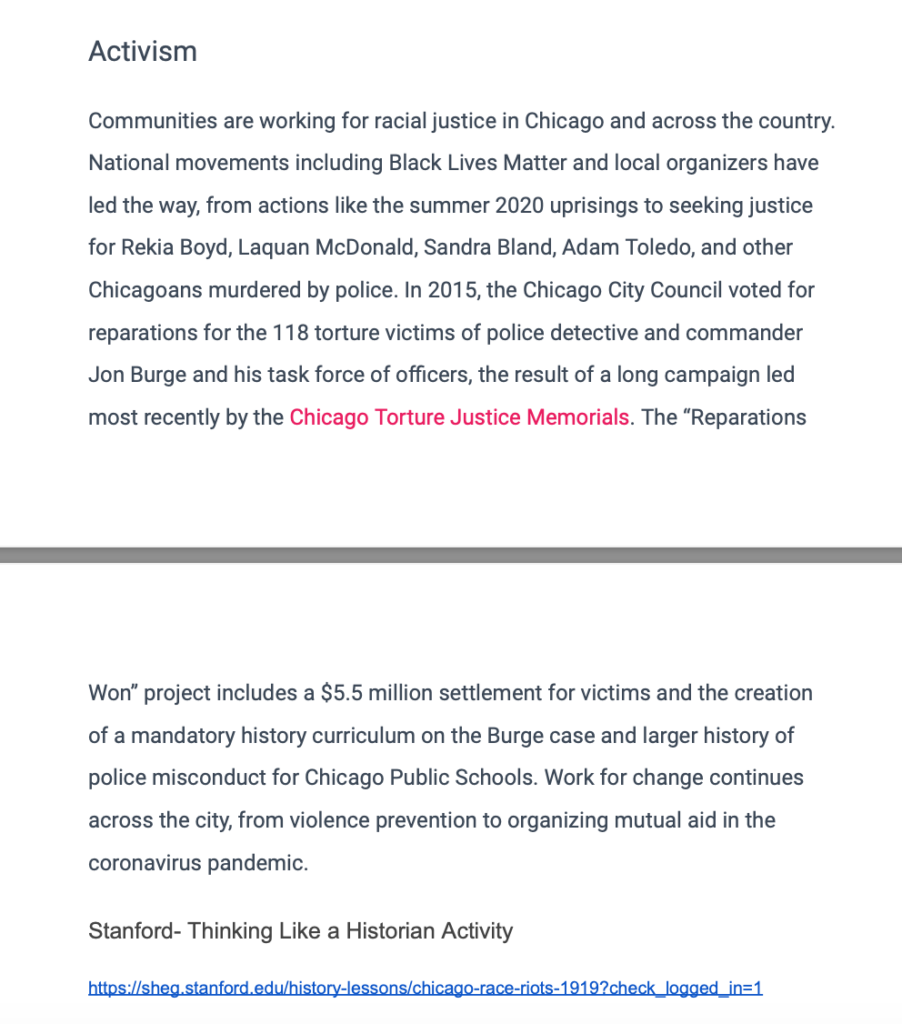 Likewise, a lesson about the Chicago Race Riot of 1919 critiques modern policing and legal systems while promoting the 2020 George Floyd protests, saying,