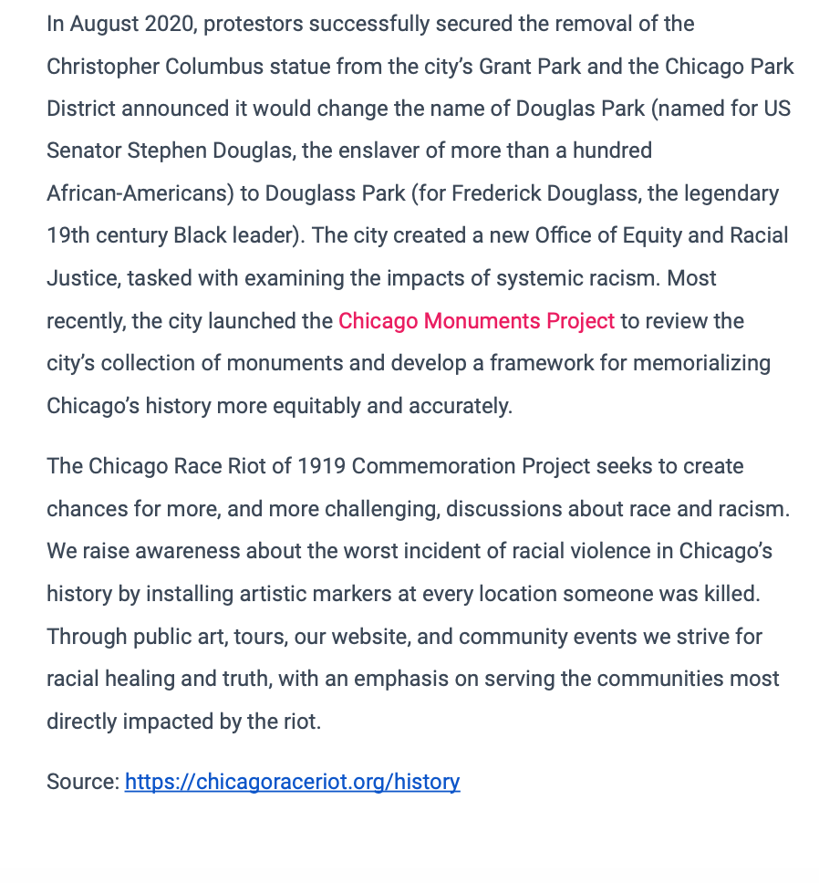 It also celebrates protestors “successfully secur[ing] the removal of the Christopher Columbus statue from the city’s Grant Park” and the city creating an “Office of Equity and Racial Justice, tasked with examining the impacts of systemic racism” in 2020.