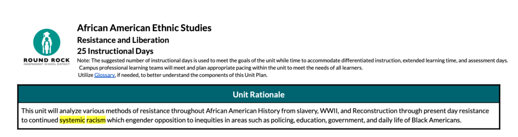 Parents Defending Education received documents via public records request detailing the curriculum and development of Round Rock ISD’s African American Studies course. The course, titled “Advanced Ethnic Studies: African American Studies,” was offered as an elective during the 2023-2024 school year to 9-12 grade students. It is also listed in the course catalog for the next academic year, 2024-2025.