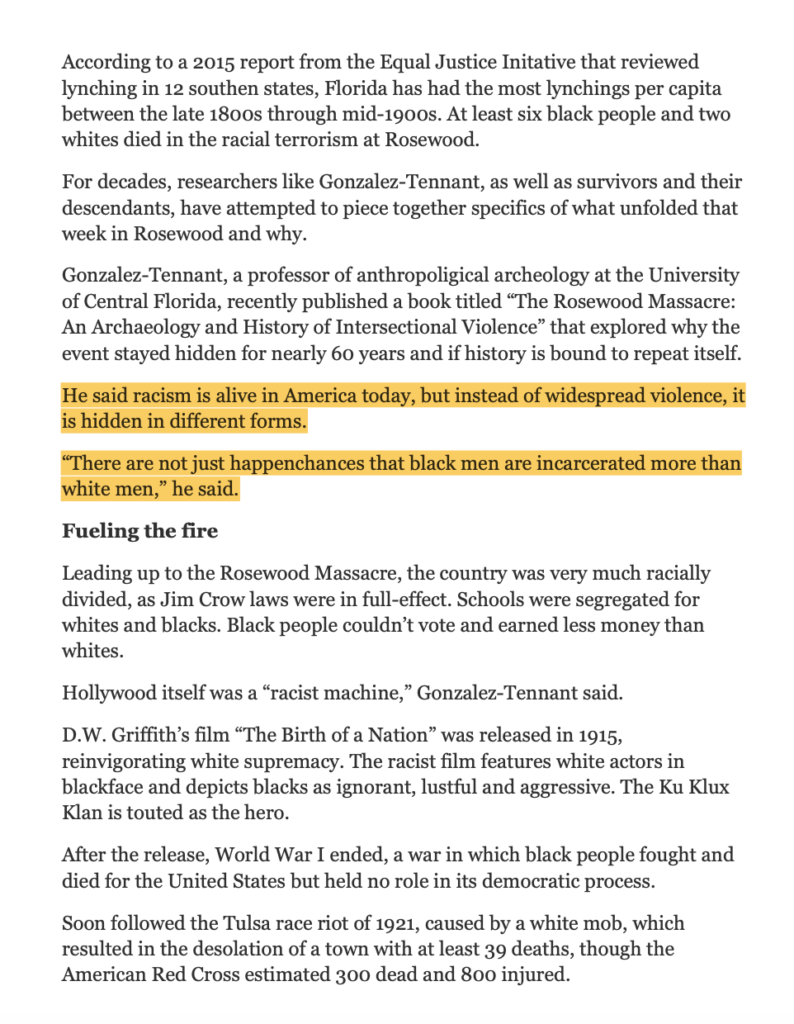Several lessons about historical “Black Massacres” also allege that modern policing and legal systems have racist underpinnings. A lesson entitled “Black Massacres: Rosewood,” about 1923 mob violence that caused the deaths of many black residents of Rosewood, Florida, includes references to an interview with Edward Gonzalez-Tennant, who researched the event. The interview, however, focuses on the present: “He said racism is alive in America today, but instead of widespread violence, it is hidden in different forms. ‘There are not just happenchances that black men are incarcerated more than white men,’ he said.”