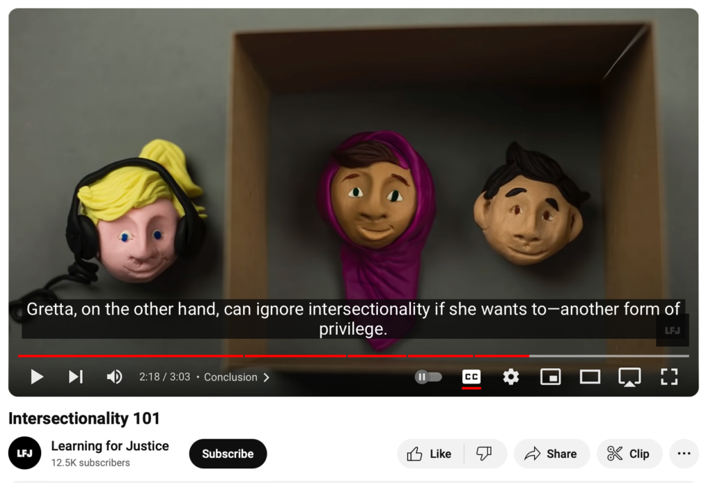 The curriculum also includes a unit on “Origins, Identity, and Agency.” The learning goal for the unit is that “Students will be able to … explain intersectionality between race, nationality, gender, etc… analyze the significance of identity nomenclature relevant to African Americans… explain the effects of assimilation, stereotypes, and oppression on the lives of African Americans.” A lesson for the unit includes a video from the Southern Poverty Law Center that claims that a Muslim student and a student experiencing poverty are “members of marginalized groups; they don’t get to choose whether or not to think about their identities” while a white, middle-class student experiences “privilege” by ignoring “intersectionality.”