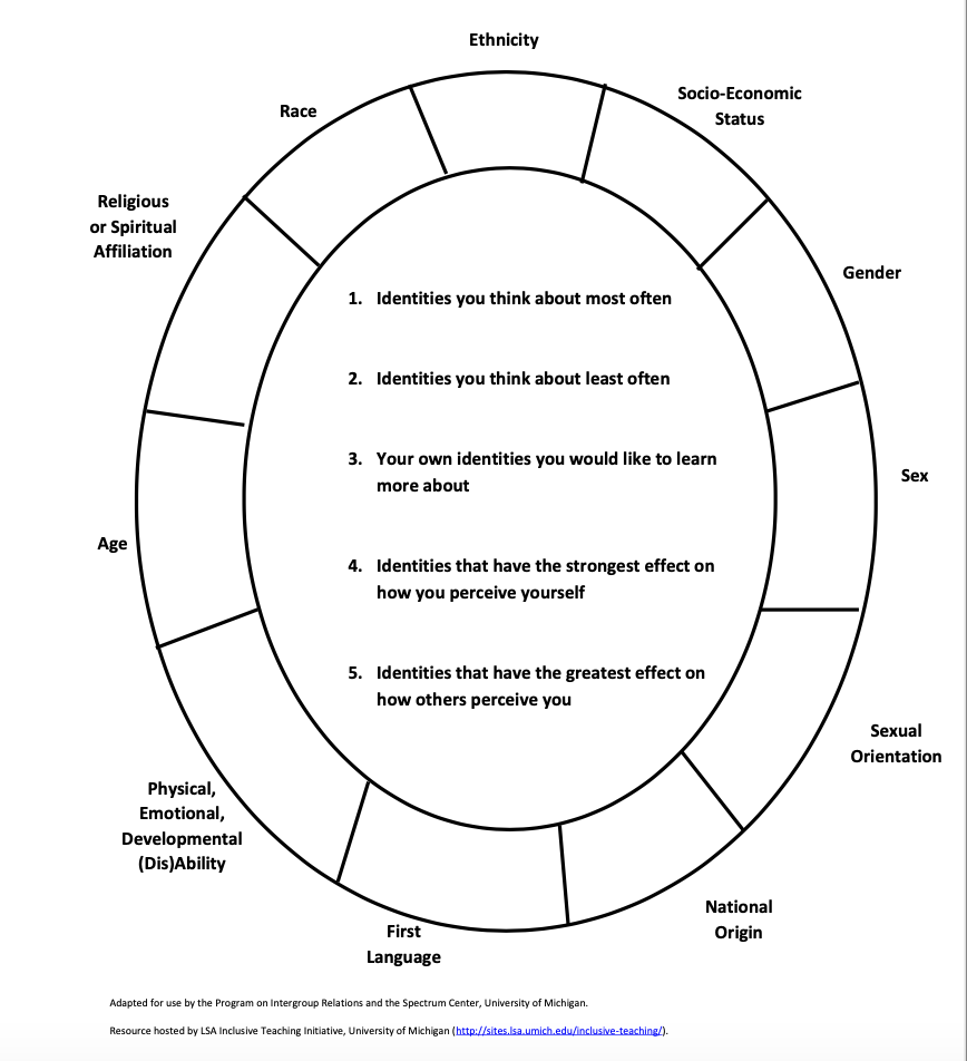 Students are also asked to fill out a “Social Identity Wheel” labeling their sexual orientation, gender identity, race, and economic status, among other categories. Students are then asked to draw the identity they think about most often, and discuss that identity and drawing with classmates.
