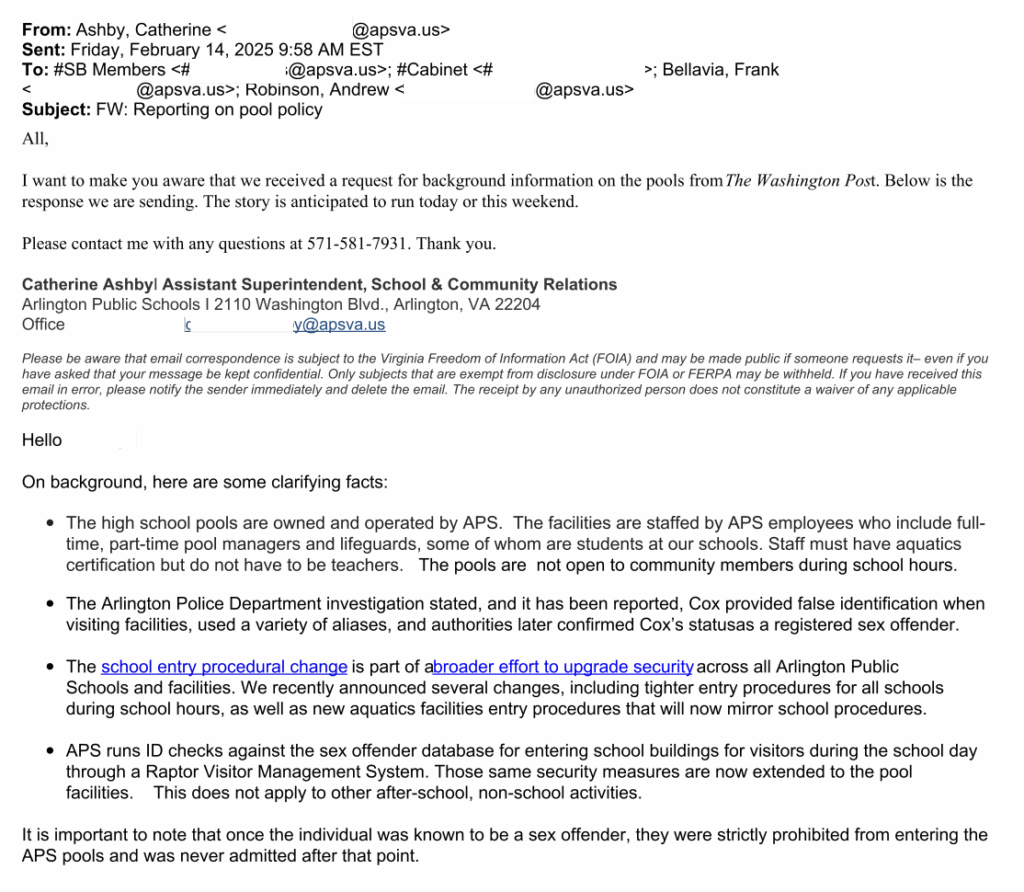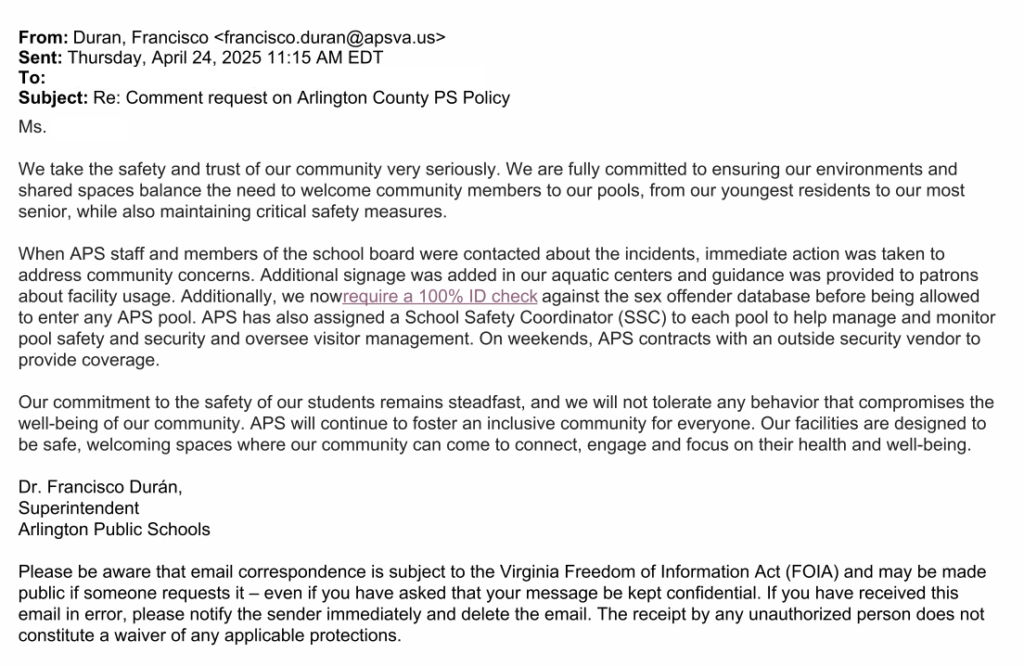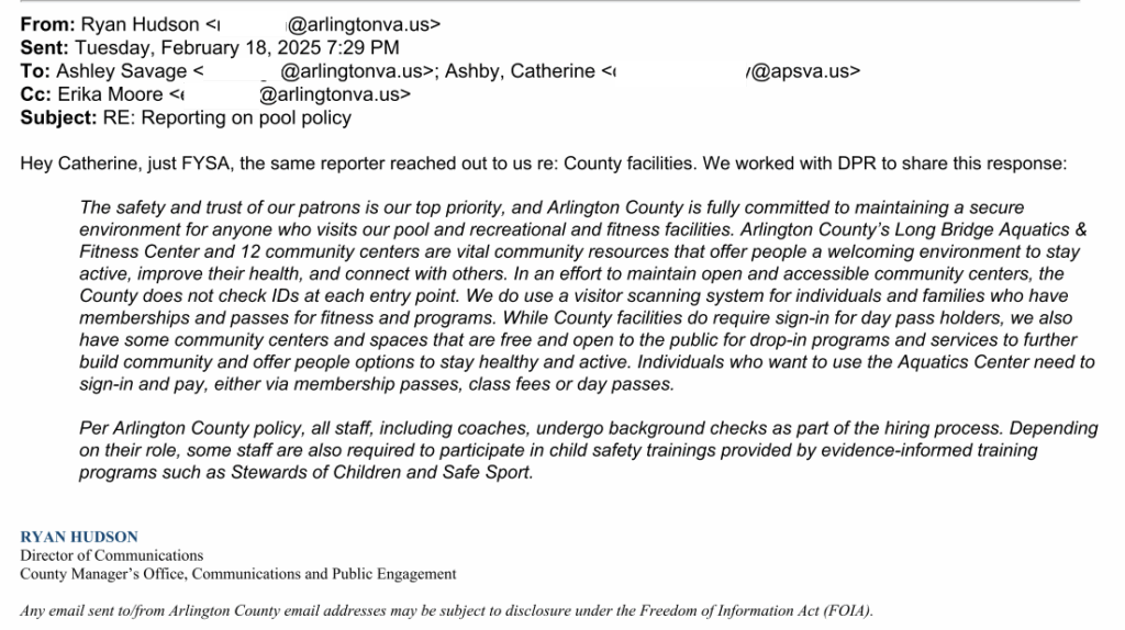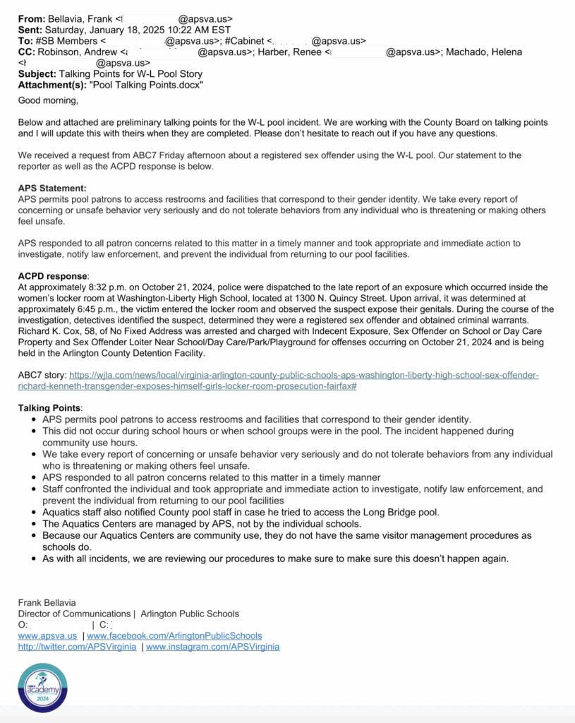 In January 2025, the Arlington Public Schools said it was working with the Arlington County Board on “talking points” regarding the “W-L Pool Incident,” reiterating APS policy that “permits pool patrons to access restrooms and facilities that correspond to their gender identity” and that the “incident happened during community use hours.”
