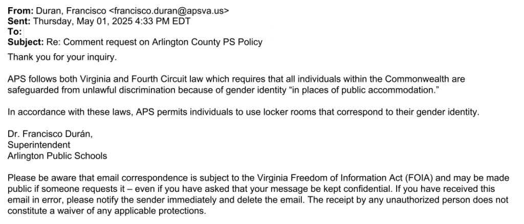 When the reporter followed up, clarifying that APS policy still allowed biological men to enter a female locker room if they identify as transgender, Durán said “APS follows both Virginia and Fourth Circuit law which requires that all individuals within the Commonwealth are safeguarded from the unlawful discrimination because of gender identity ‘in places of public accommodation'” and “permits individuals to use locker rooms that correspond to their gender identity.”