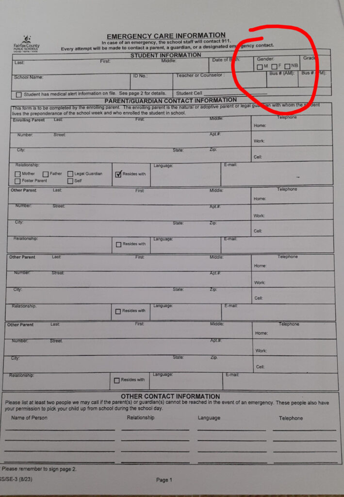 Fairfax County Public Schools (FCPS) in Virginia offers three gender options on the “Emergency Care Information” medical forms given to parents and legal guardians of students: M (male), F (female) and NB (non-binary). This is for students in K-12.