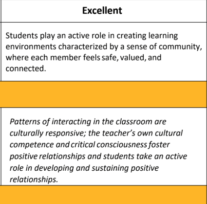 Under “Teacher – Domain 2: Learning Environments,” the framework states that an “excellent” rating is achieved when “patterns of interacting in the classroom are culturally responsive; the teacher’s own cultural competence and critical consciousness foster positive relationships and students take an active role in developing and sustaining positive relationships.”