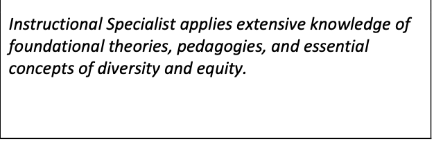 Under the domain titled “Planning and Preparation,” Instructional Specialists are evaluated on the “critical attributes” category labeled “Demonstrates knowledge of diversity and equity and applies that knowledge in planning.” In order to receive an “excellent” rating, they must apply “extensive knowledge of foundational theories, pedagogies, and essential concepts of diversity and equity.”