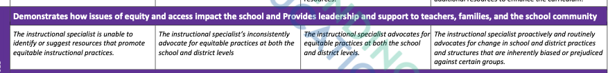For “Domain 3,” an Instructional Specialist “Demonstrates how issues of equity and access impact the school and Provides leadership and support to teachers, families, and the school community.” This means the instructional specialist “proactively and routinely advocates for change in school and district practices and structures that are inherently biased or prejudiced against certain groups.”