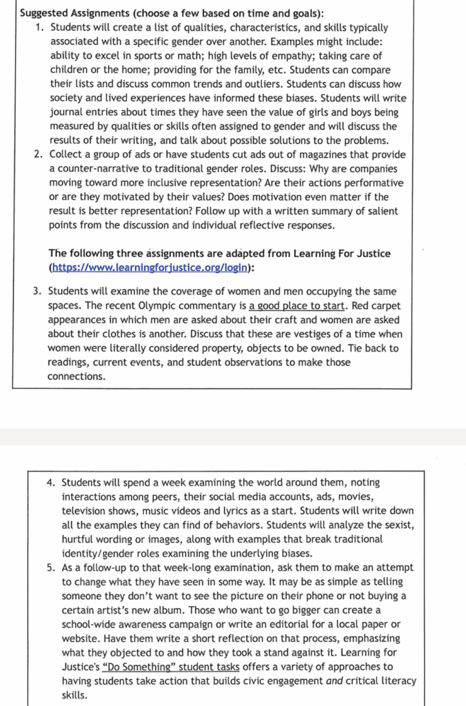 One assignment asks students to spend a week “examining the world about then, noting interactions among peers, their social media account, ads, movies, television shows, music videos and lyrics … to analyze the sexist, hurtful working or images, along with examples that break down traditional identity/gender roles examining the underlying biases.”