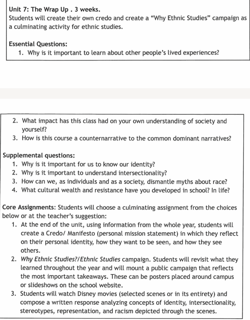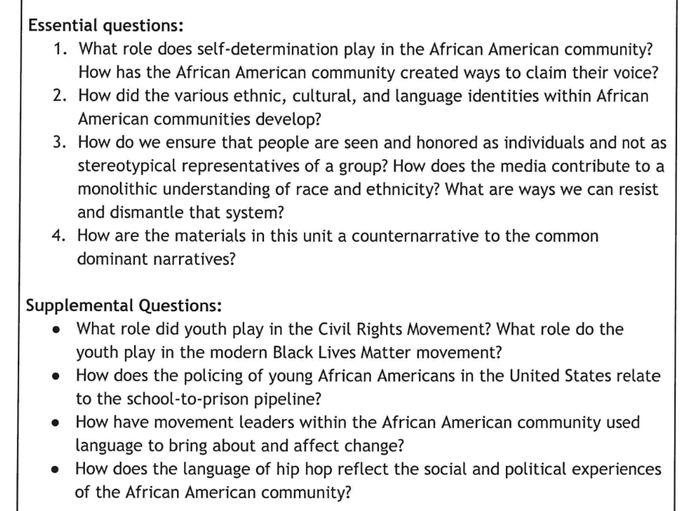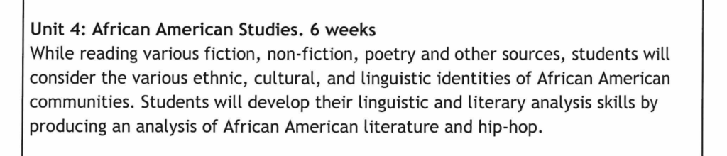 Unit 4: African American Studies, in which students will study “various ethnic, cultural, and linguistic identities of African American communities.”