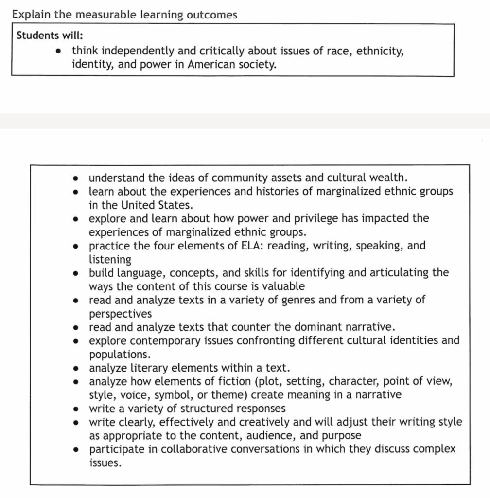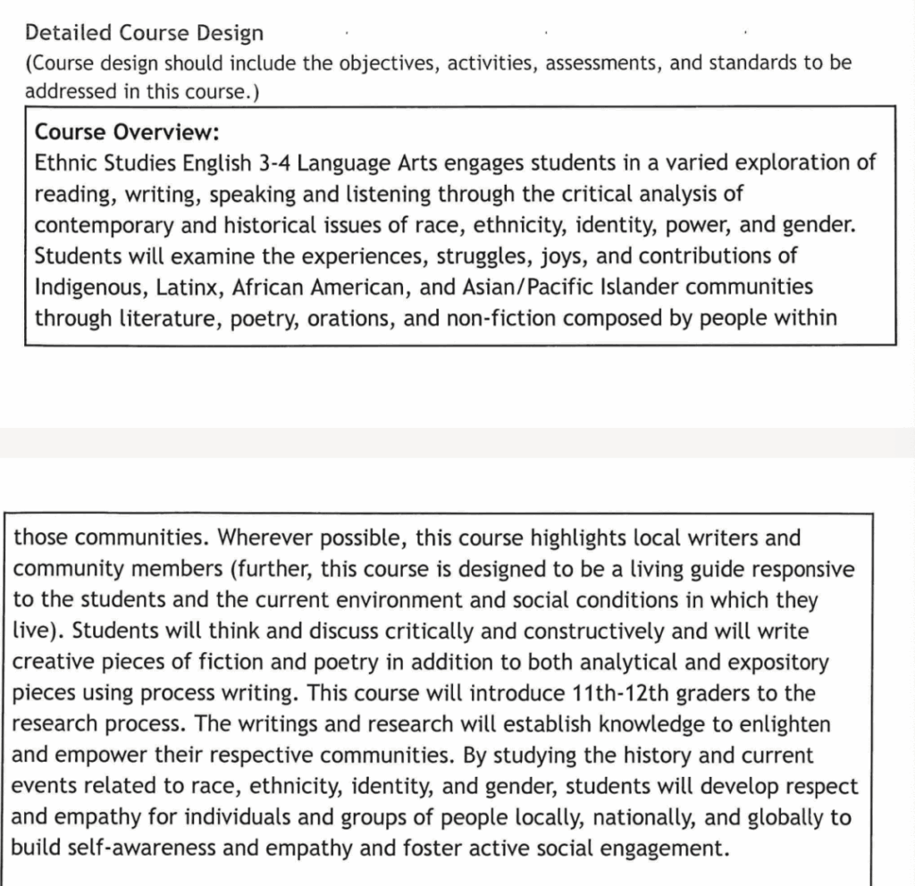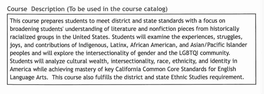 The course description states that it will prepare students: “to meet district and state standards with a focus on broadening students’ understanding of literature and nonfiction pieces from historically racialized groups in the United States. Students will examine the experiences, struggles, joys, and contributions of Indigenous, Latinx, African American, and Asian/Pacific Islander peoples and will explore the intersectionality of gender and the LGBTQI community.”