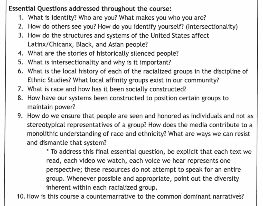 Santa Rosa City Schools (SRCS) in California proposed and approved an ethnic studies course that satisfies 10 English credits with learning outcomes aimed at instructing students to: “think independently and critically about issues of race, ethnicity, and power in American society,” “learn more about the experiences and histories of marginalized ethnic groups in the United States” and “explore and learn about how power and privilege has impacted the experiences of marginalized ethnic groups.”