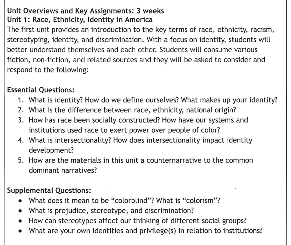 The course overview states students will study “the history and current events related to race, ethnicity, identity, and gender, students will develop respect and empathy for individuals and groups of people locally, nationally, and globally to build self-awareness and empathy and foster active social engagement.”