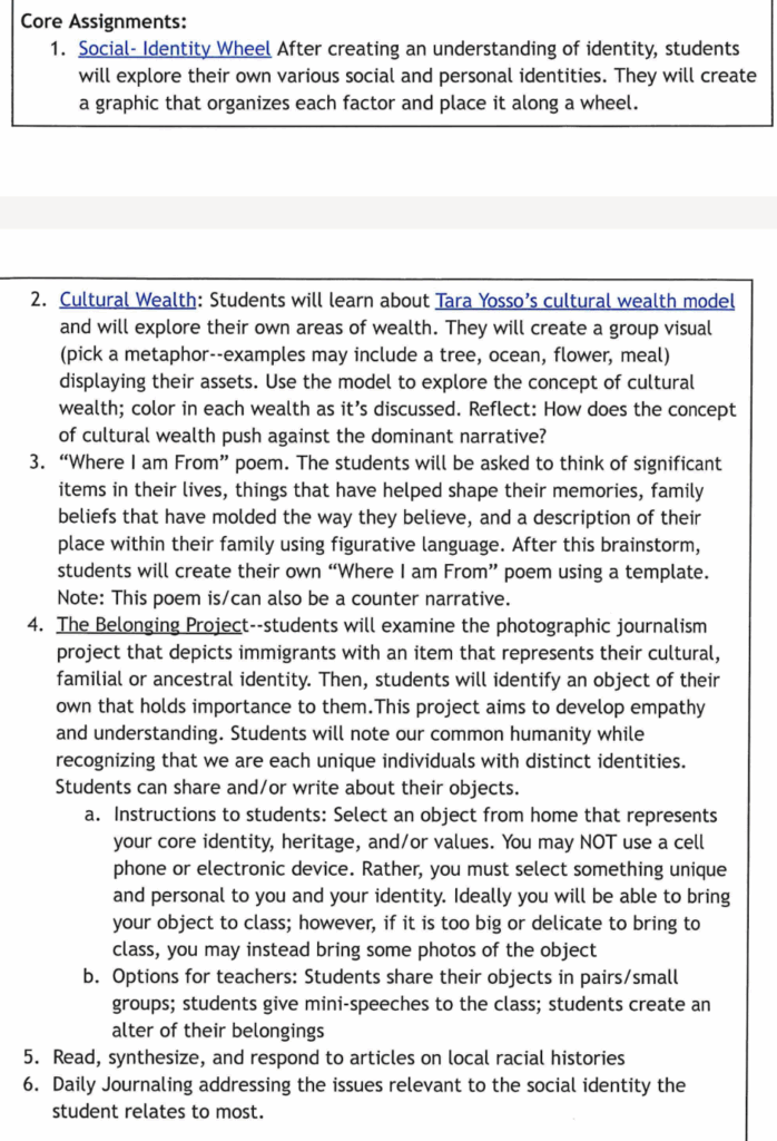 Assignments include: the Social-Identity wheel, Tara Yosso’s cultural wealth model and the Belonging Project.
