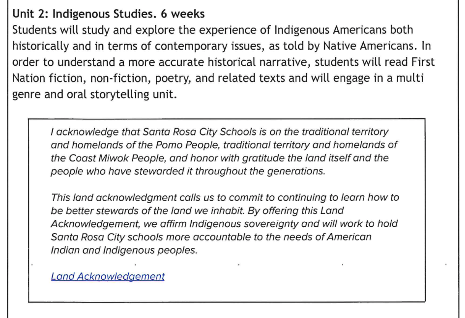 Unit 2: Indigenous Studies, which explores “the experience of Indigenous Americans both historically and in terms of contemporary issues, as told by Native Americans.”