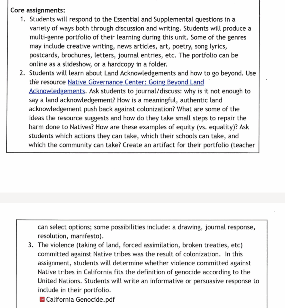 Assignments include land acknowledgements and a discussion about whether violence committed against Native tribes in California fits the United Nations’ definition of genocide.