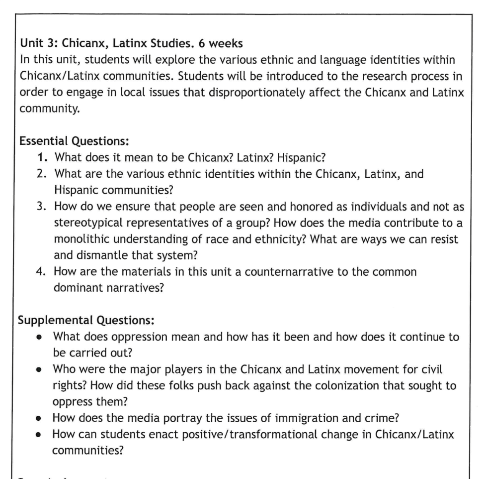 Unit 3: Chicanx, Latinx studies, in which students “explore the various ethnic and language identities within Chicanx/Latinx communities.”