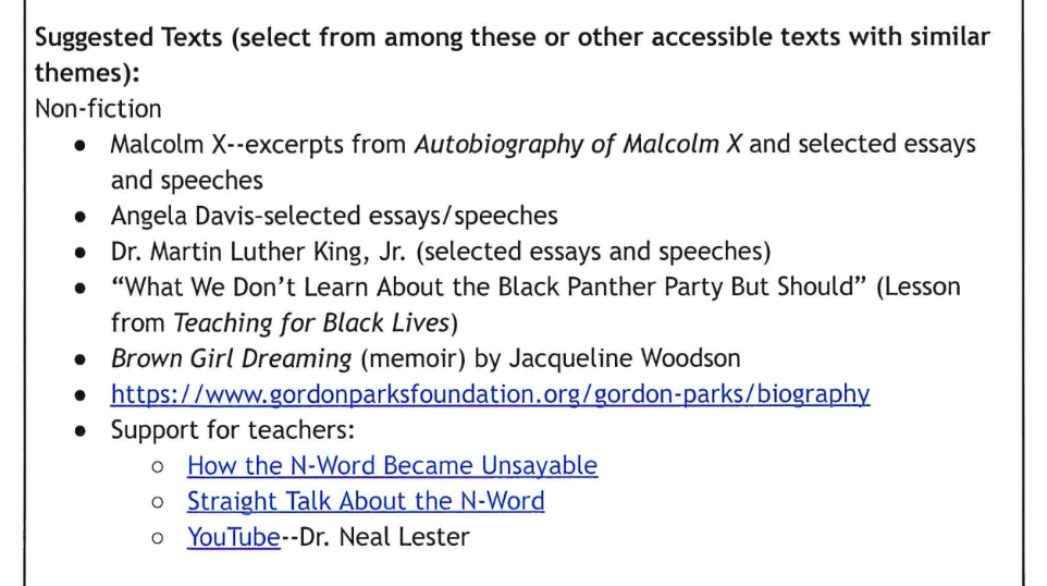 Suggested texts include the works of Malcom X and Angela Davis.