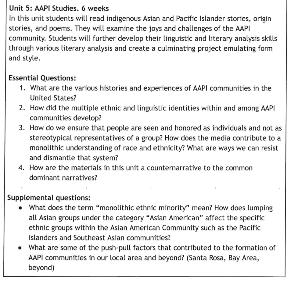 Unit 5: AAPI Studies, in which students “read indigenous Asian and Pacific Islander stories, origin stories, and poem” and “examine the joys and challenges of the AAPI community.”