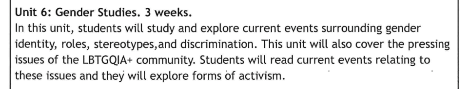 Unit 6: Gender Studies, in which students will “study and explore current events surrounding gender identity, roles, stereotypes, and discrimination,” as well as “the pressing issues of the LGBTQIA+ community. Students will read current events relating to these issues and they will explore forms of activism.”