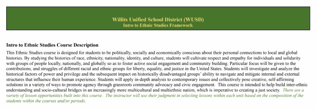 Ethnic Studies is offered to students grades 9 through 12 at Willits Unified School District, instructing students “to apply in-depth analysis to contemporary issues and collectively pose creative, self-affirming solutions in a variety of ways to promote agency through grassroots community advocacy and civic engagement. This course is intended to help build inter-ethnic understanding and socio-cultural bridges in an increasingly more multicultural and multiethnic nation, which is imperative to creating a just society.”