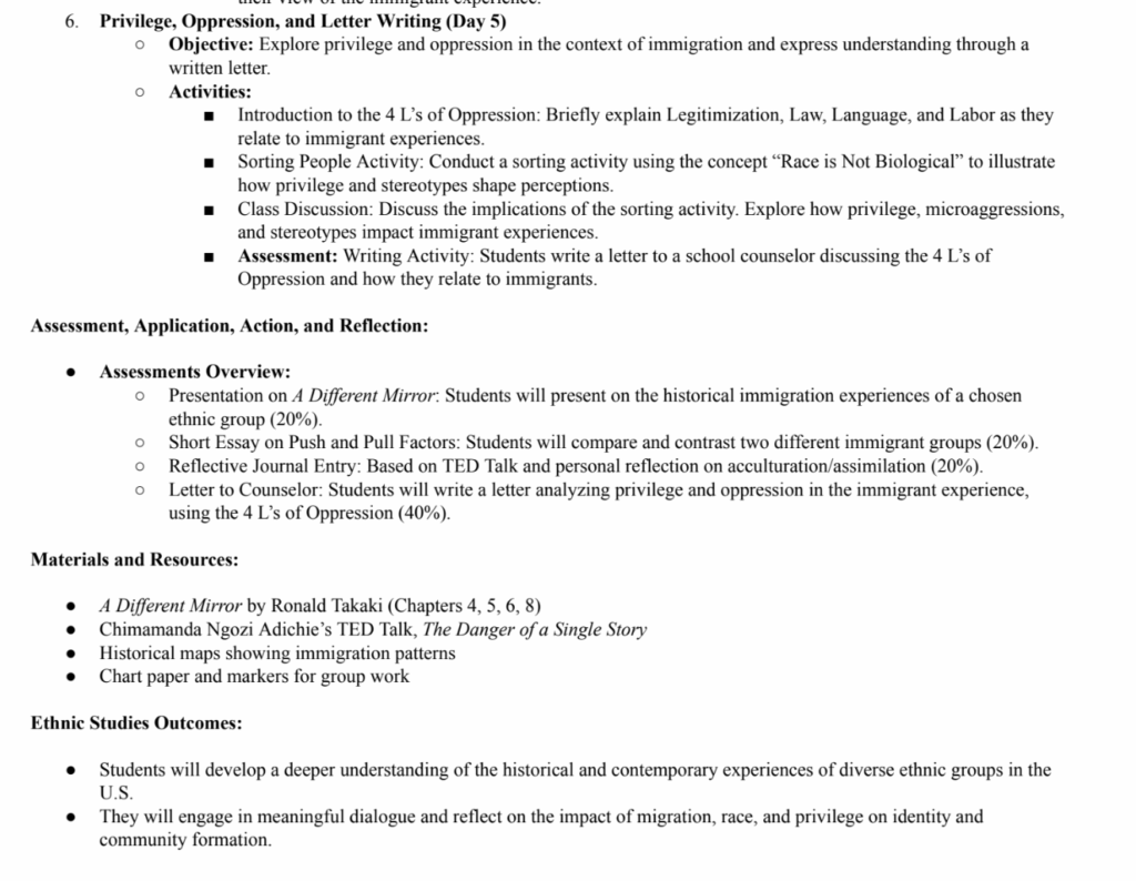 One activity instructs students to “explore privilege and oppression in the context of immigration and express understanding through a written letter.”
