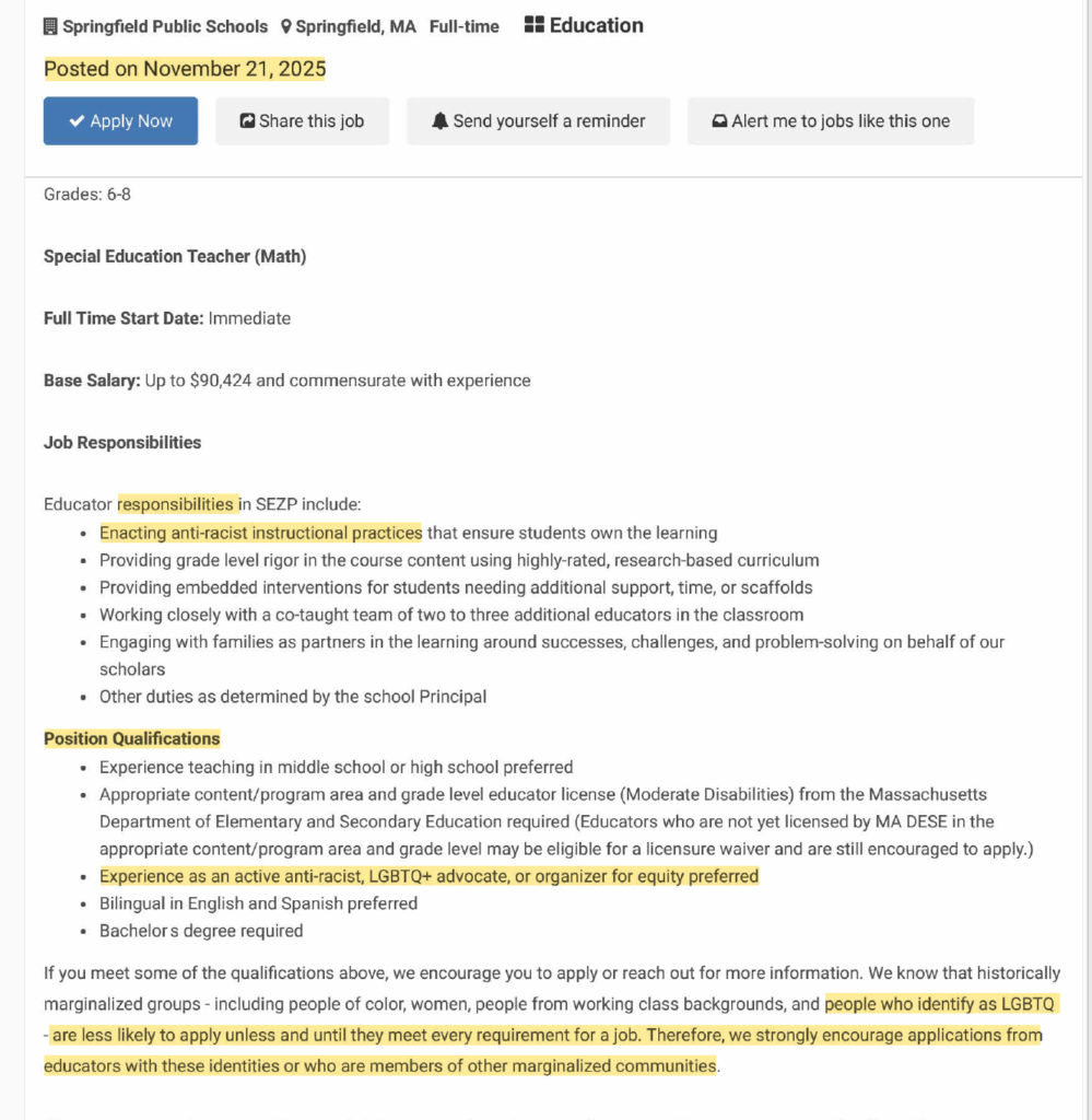 Springfield Public Schools in Massachusetts is advertising a middle school special education math teaching job, with a focus on “anti-racist instructional practices that ensure students own the learning.”