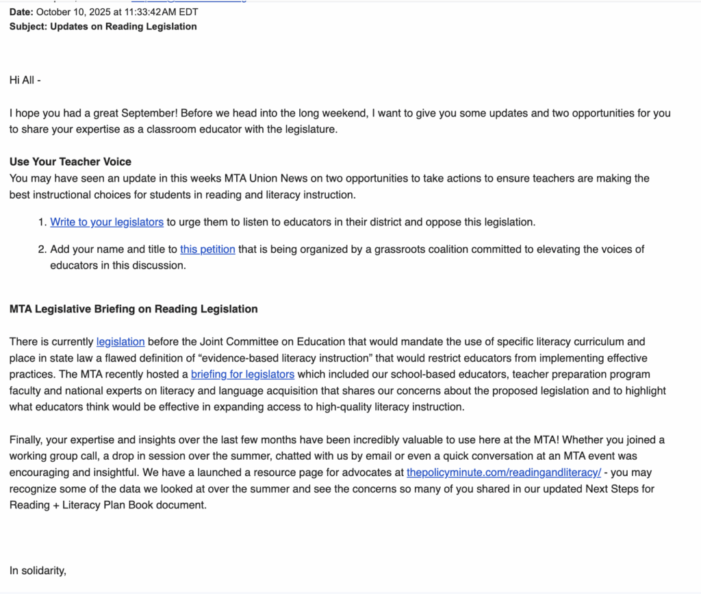 - An email on October 10, 2025 from the MTA’s education policy specialist.