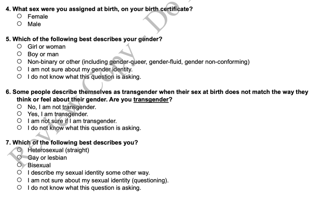 Explained transgender as “when [a person thinks] their sex at birth does not match the way they think or feel about their gender,” then asks: “Are you transgender?”