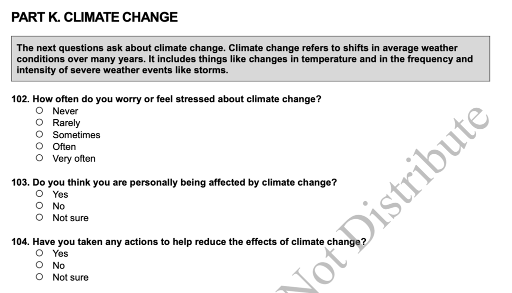 One part of the survey asked students about climate change and whether they “worry or feel stressed about climate change?” think they “are personally being affected by climate change?” and if they have “taken any actions to help reduce the effects of climate change?”