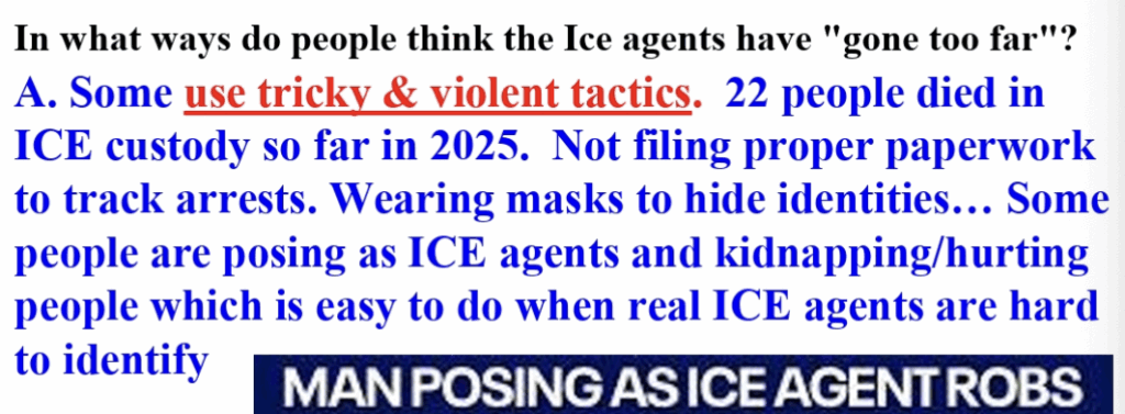 The material immediately after reads, “In what ways do people think the Ice agents have ‘gone too far’?” The powerpoint then goes through four reasons, first showing their “tricky & violent tactics.” The geography lesson continues, sharing that people are posing as ICE agents to kidnap and hurt immigrants.