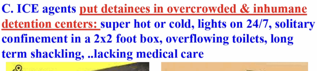 The geography lesson then covers ICE agents putting detainees in “overcrowded & inhumane detention centers,” referring to “overflowing toilets,” “solitary confinement in a 2×2 foot box,” and “super hot or cold” conditions, while lacking medical care.
