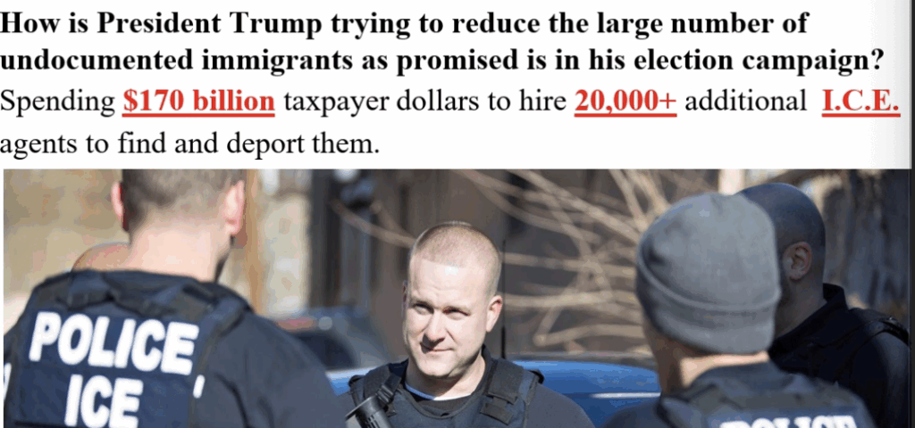 The lesson plan, regarding immigration and ICE, first asks the question, “How is President Trump trying to reduce the large number of undocumented immigrants as promised is in his election campaign?” The response, infused with links is, “Spending $170 billion taxpayer dollars to hire 20,000+ additional I.C.E. agents to find and deport them.”