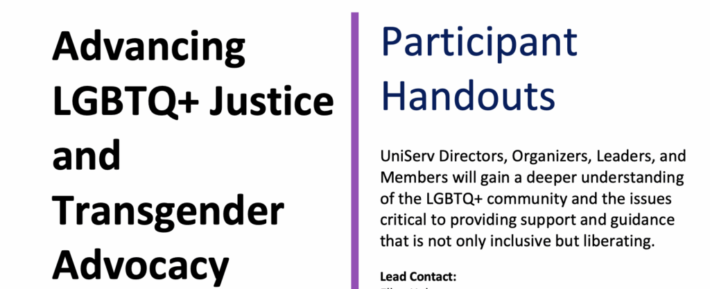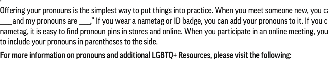 In this same handout document, the NEA discusses the importance of pronouns, asking participants to be the first in a given setting to share their pronouns.