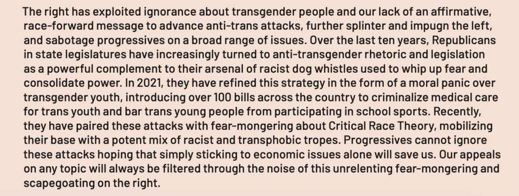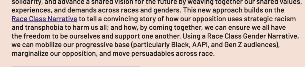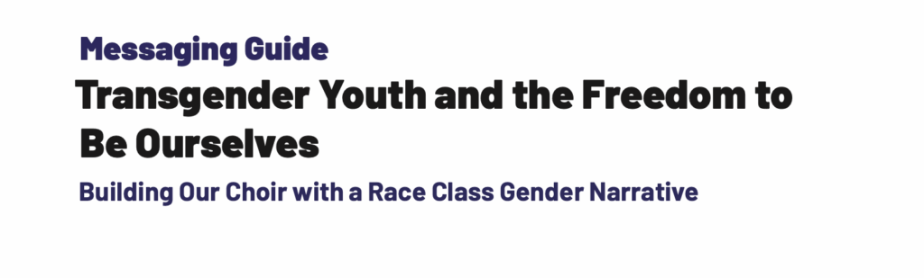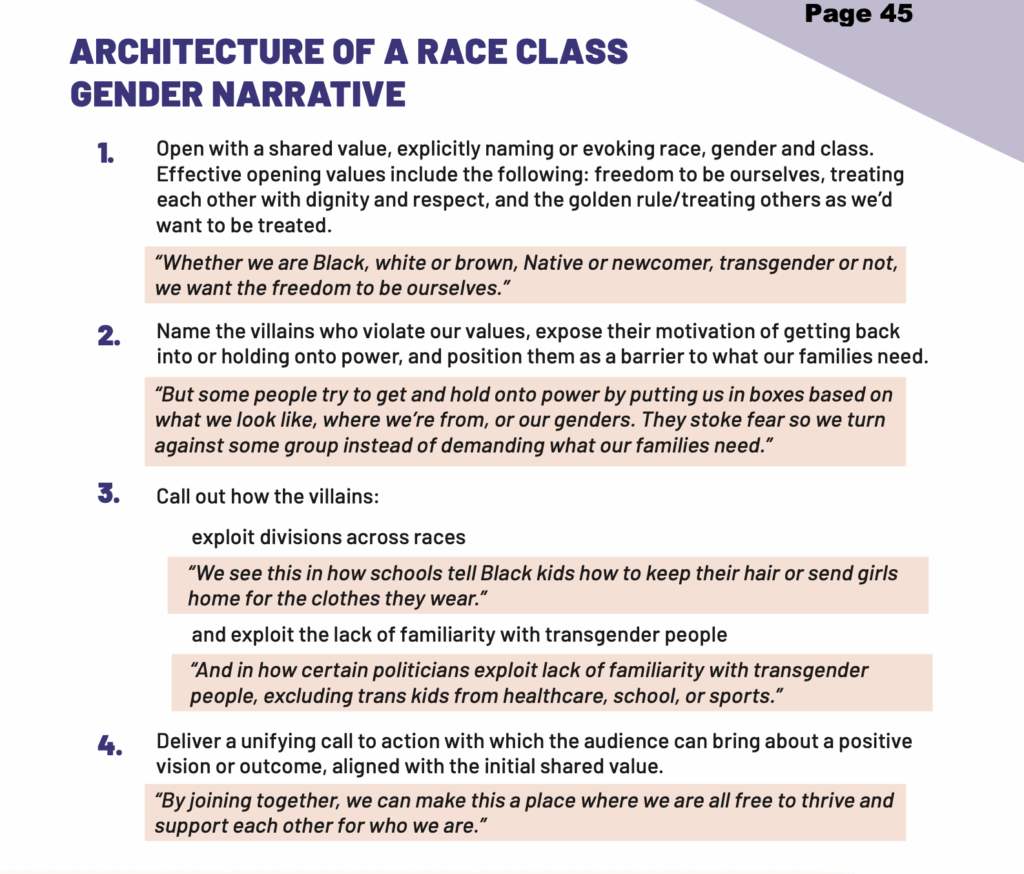 A section in the Participant Handout titled “Messaging Guide / Transgender Youth and the Freedom to Be Ourselves / Building Our Choir with a Race Class Gender Narrative,” calls out “Republicans” and “their arsenal of racist dog whistles … mobilizing their base with a potent mix of racist and transphobic tropes.”