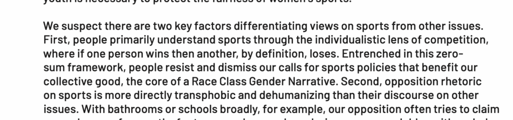The NEA then utilizes the “Race Class Gender Narrative” in the context of women’s sports, citing that the opposition uses the “physicality of the issue to directly spout dehumanizing stereotypes.”