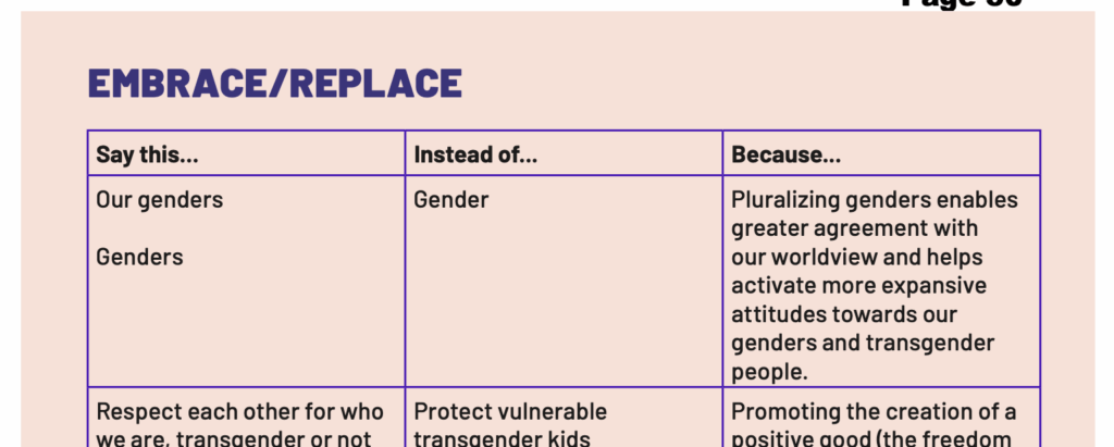 In the following section in the training titled “Embrace/Replace,” the NEA promotes the pluralization of gender, arguing teachers should say “our genders” and “genders” instead of “gender” in order to “activate more expansive attitudes towards our genders and transgender people.”