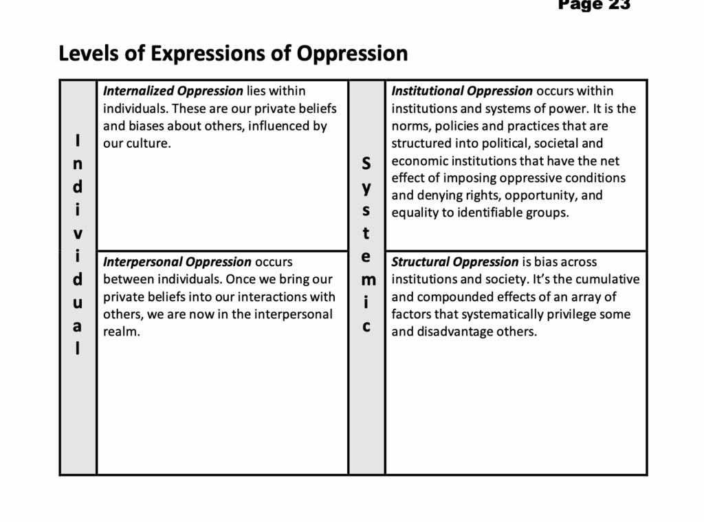 In a section titled “Expressions of Oppression,” the NEA discusses four levels of oppression: structural oppression, institutional oppression, internalized oppression, and interpersonal oppression. After this explanation, the training presents 10 scenarios of oppression and asks participants to assign a category of oppression to each.