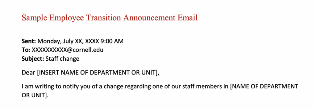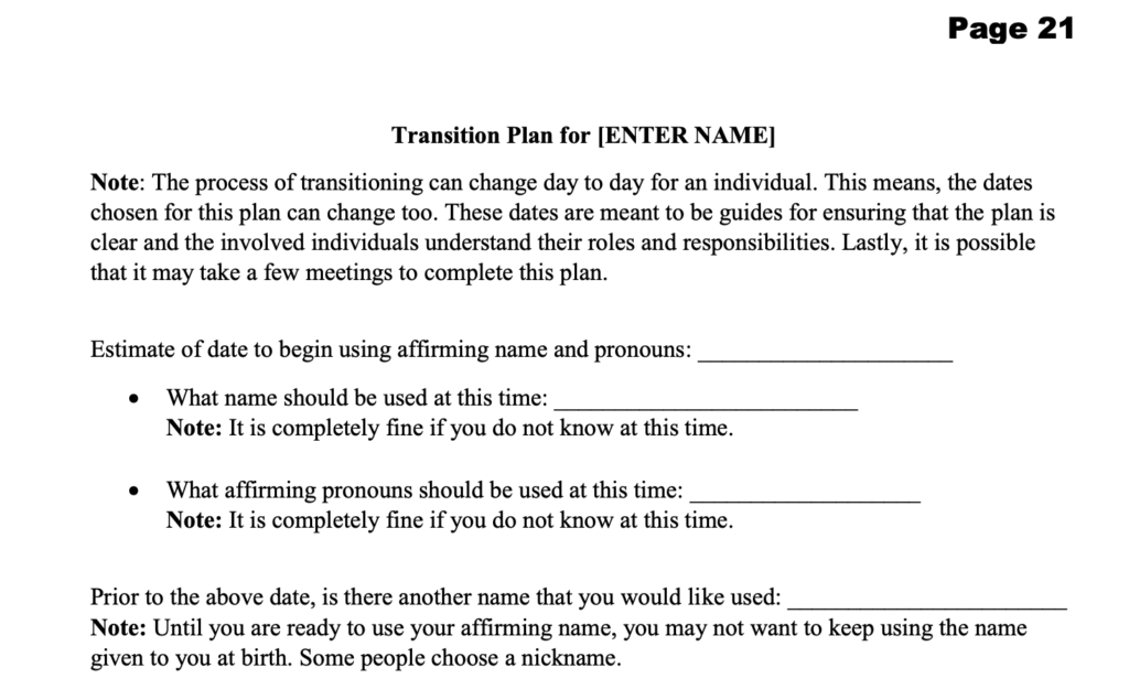 The training document also includes Cornell University’s “Transgender Guide to Transitioning & Gender Affirmation in the Workplace,” which outlines how employees can “transition” and provides sample Transition Plans and a “Sample Employee Transition Announcement Email.”
