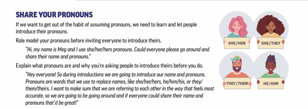 The NEA continues, explaining that pronouns are important tools to avoid gender assumptions. The NEA suggests that participants be vigilant about including their pronouns on any identification, even suggesting that participants purchase pronoun pins if they can’t alter their identification badge.