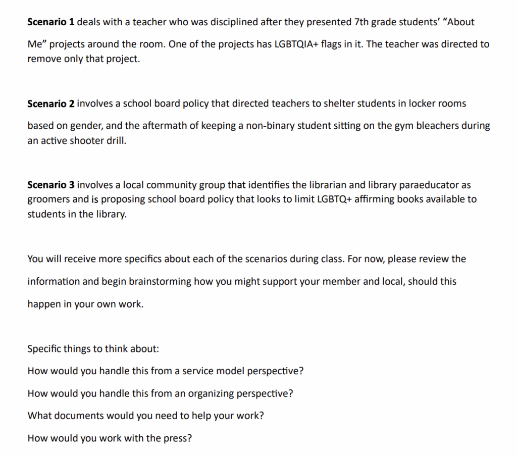 The training materials conclude with three LGBTQ+ scenarios for participants to read and develop possible solutions for. These scenarios include: