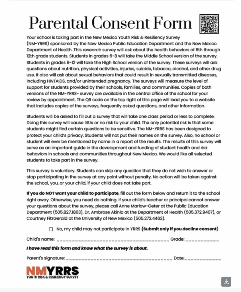 Doing this survey will cause little or no risk to your child. The only potential risk is that some students might find certain questions to be sensitive. The NM-YRRS has been designed to protect your child’s privacy. Students will not put their names on the survey. Also, no school or student will ever be mentioned by name in a report of the results. The results of this survey will serve as an important guide in the development and funding of student health and risk behaviors in schools and communities throughout New Mexico. We would like all selected students to take part in the survey.
