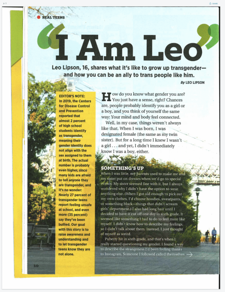 The article “I am Leo” is a first-person narrative from a 16-year-old, who describes in detail the experience of realizing he was transgender after being designated female at birth. He recounts feeling uncomfortable with feminine expectations, discovering the term “non-binary” online during puberty and initially coming out to his family using they/them pronouns. As he entered seventh and eighth grade, he describes frequent misgendering at school and being asked to explain gender concepts to classmates.