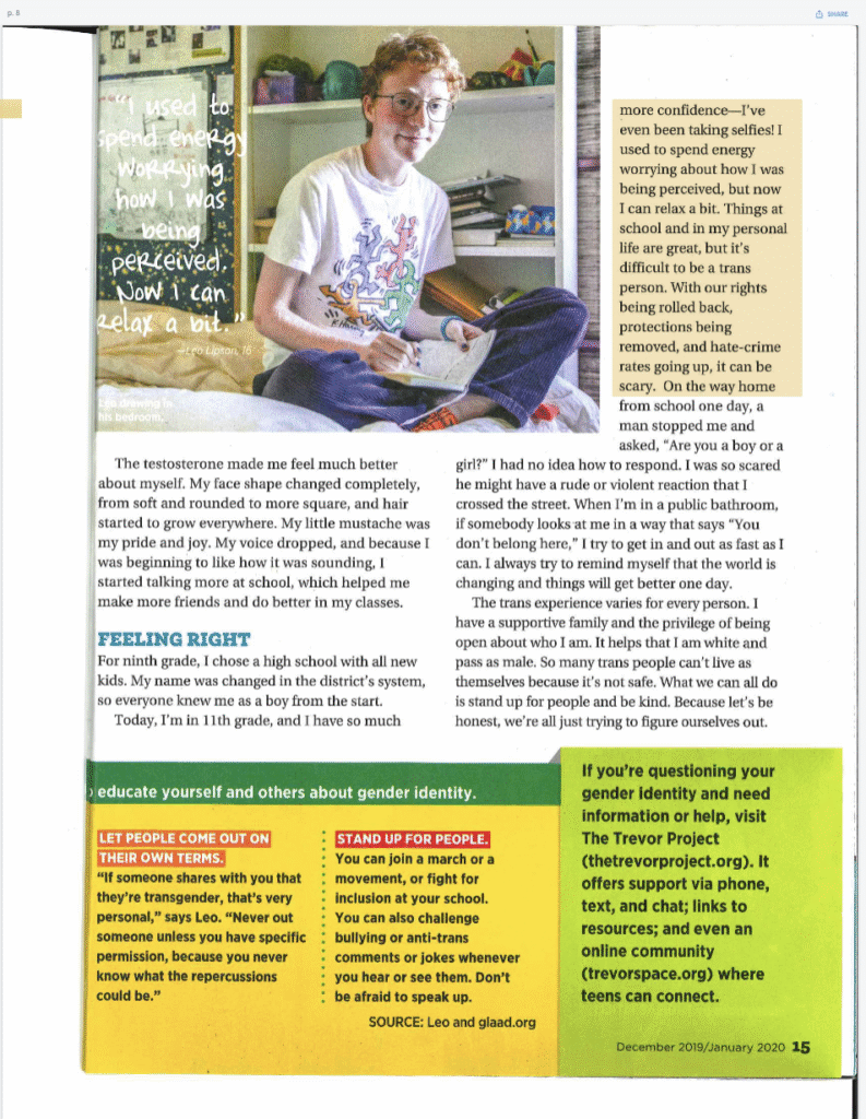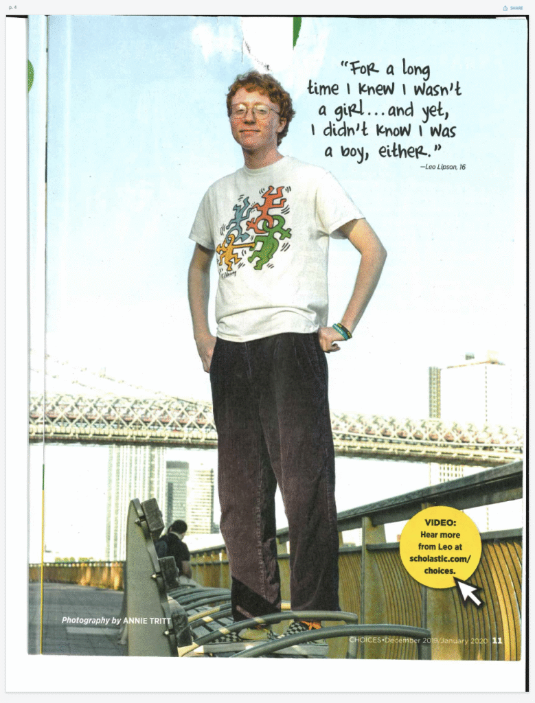 Photos of the full “I am Leo” article, which first ran in the December 2019/January 2020 issue of the Scholastic’s Choices magazine, are included below.