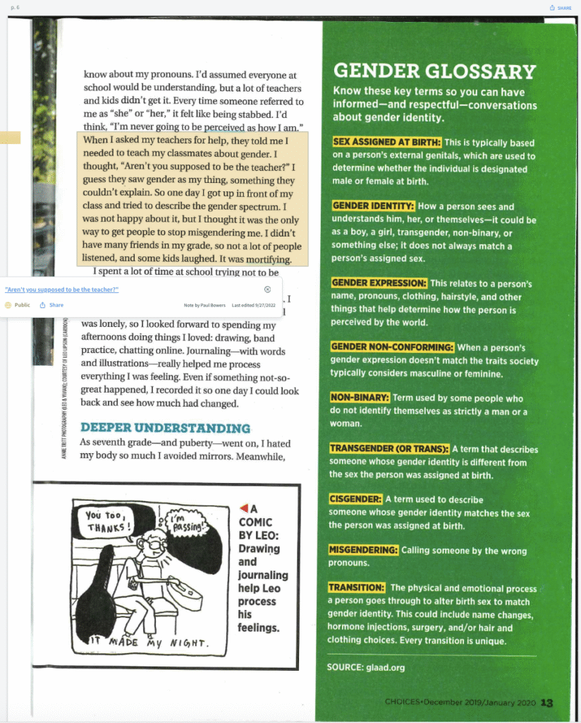 When the concerned taxpayer reached out to the district superintendent to ask if he was aware of this lesson, he directed her to a district policy that outlines the steps to take to request clarification about classroom instruction. When she followed up and explained she was a taxpayer in the district, but not a parent, he did not reply.